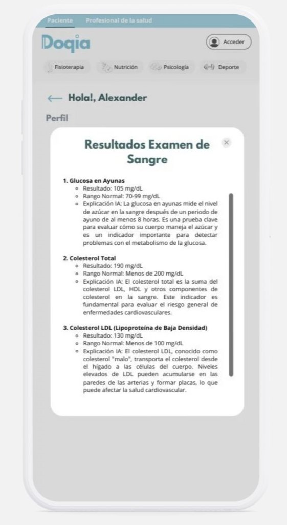 Para resolver este problema, Doqia Lab ha creado una IA que interpreta y explica los resultados de exámenes de sangre de forma simple y accesible. La IA traduce los datos médicos a un lenguaje claro, ofrece recomendaciones y facilita que los pacientes entiendan su salud, reduciendo la ansiedad y mejorando su experiencia médica.